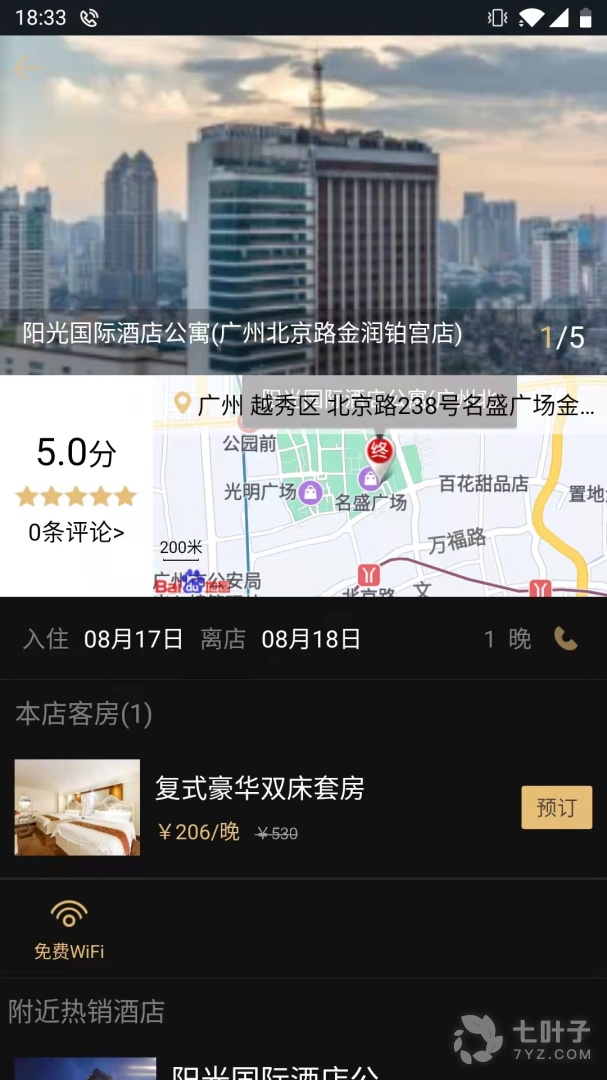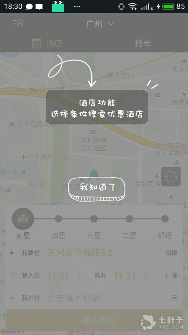 2、提供了地图,通过定位为你标记周围所有的酒店,点击即可查看详情;