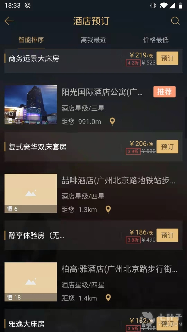 6、支持智能排序所有的酒店,按照星级、评价、距离、价格等为你进行排序;