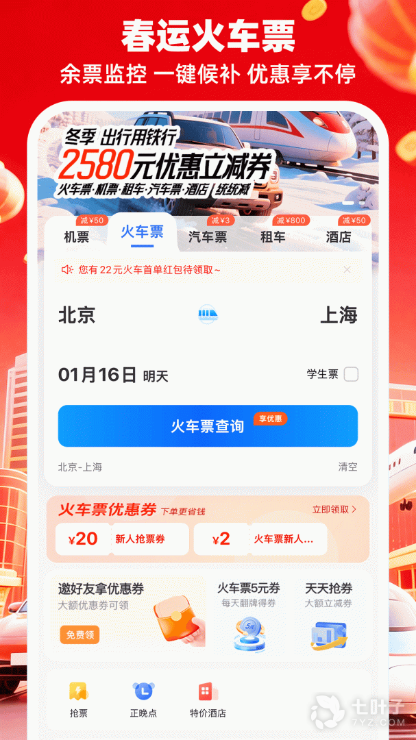新人专享919元出行大礼包+春节2580元优惠礼包券 特价机票、火车票、租车、汽车票、酒店都可减