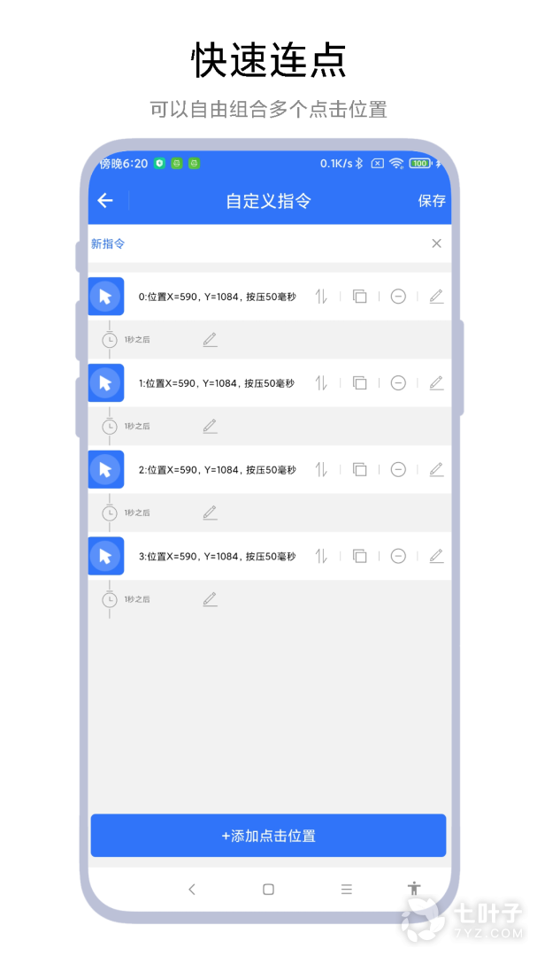 小食指连点器是一个自由设置你的点击位置模拟工具,不同的点击位置之间,可以自由设置点击间隔,软件支持用户将多个不同的点击位置自由组合起来,然后一键即可执行。执行过程会有悬浮窗提示,也可以设置按压时长,可以随时暂停或继续点击。