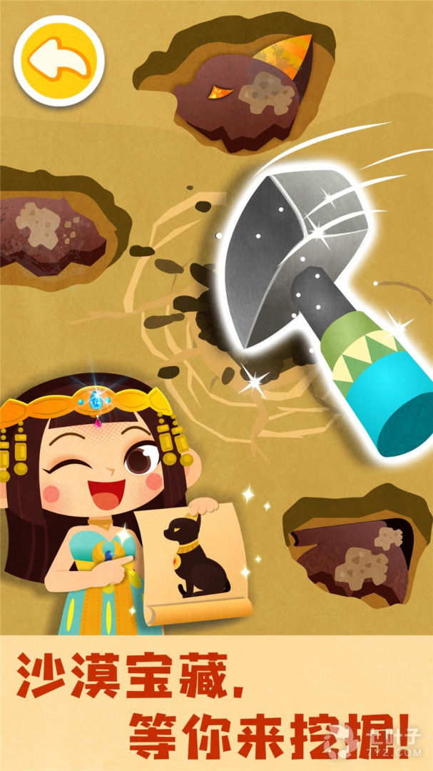 金字塔附近的沙漠,藏了好多宝藏呀,宝宝敲开石头,寻找古埃及宝藏吧~清理、拼贴宝藏碎片,有块碎片掉色了?找到对应颜色,给宝藏上色,修复宝藏!
