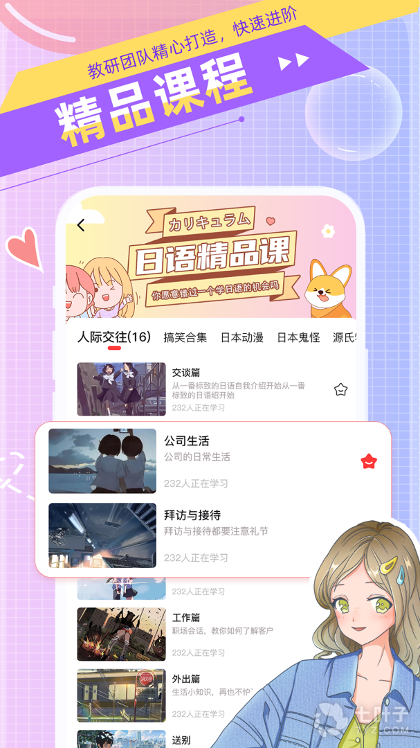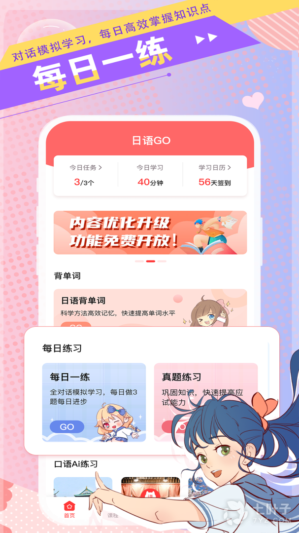 1、对于正在日语学习之路上奋力前进的小伙伴,这个日语go就是一个你的贴身良师,用轻松有趣的方式来解读各个知识点,配合不同版本的学习教材,更有海量的针对练习和日常积累的小短句,让你以一个轻松的心情来学习,最大程度的调动起学习积极性