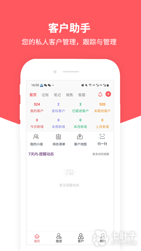 客户助手是一个为销售、业务人员定制的个人工具,提供了私人客户,提醒消息,个人笔记,跟进信息,业务收支,机会分享等功能,双向加密,让您的数据及访问安全保证和无忧.