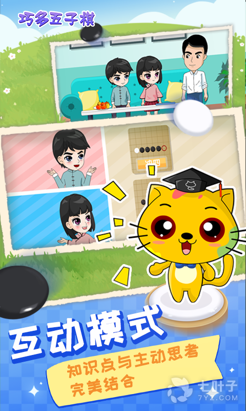 教学内容采用人物互动方式来展开,生活化的对话结合动画的表达形式,亲切自然,使得抽象枯燥的五子棋知识润物细无声的被孩子不知不觉就接受和了解。