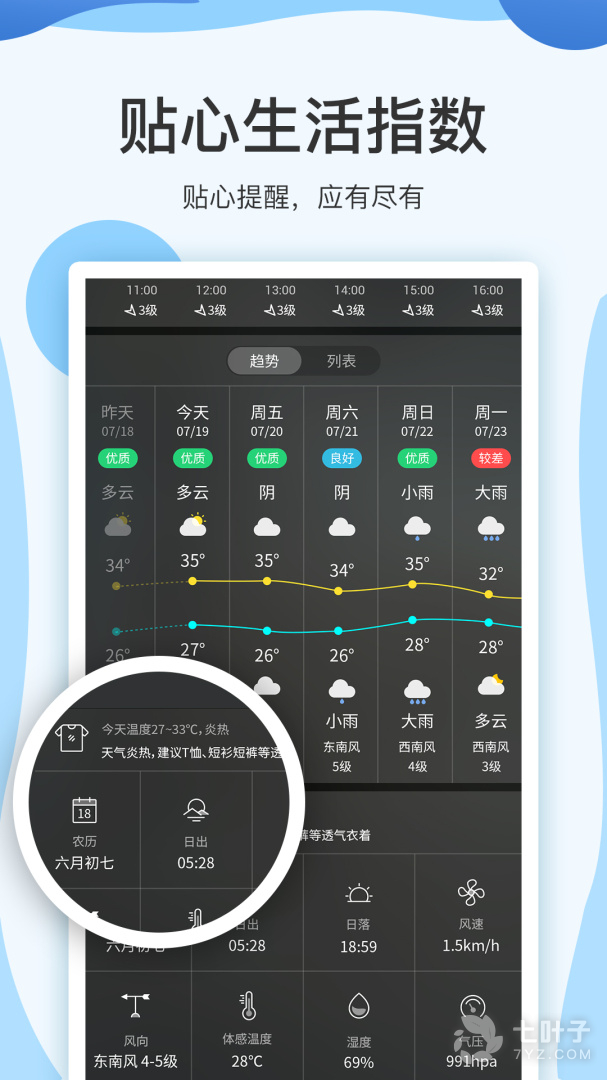 3、软件拥有空气质量,逐时预报,生活指数,预警通知,穿衣指数等等诸多功能