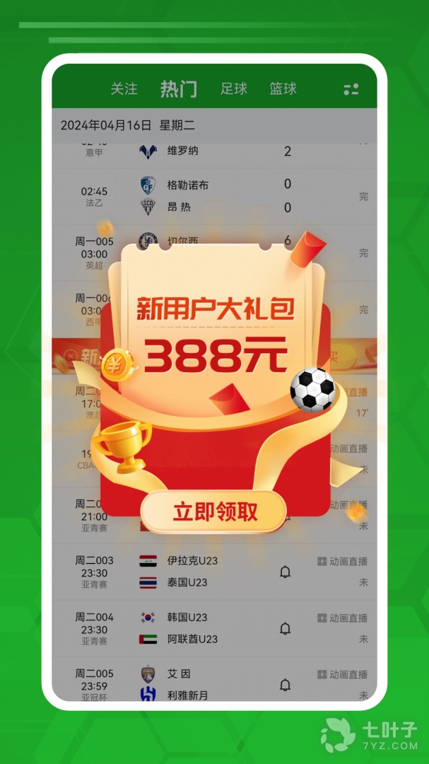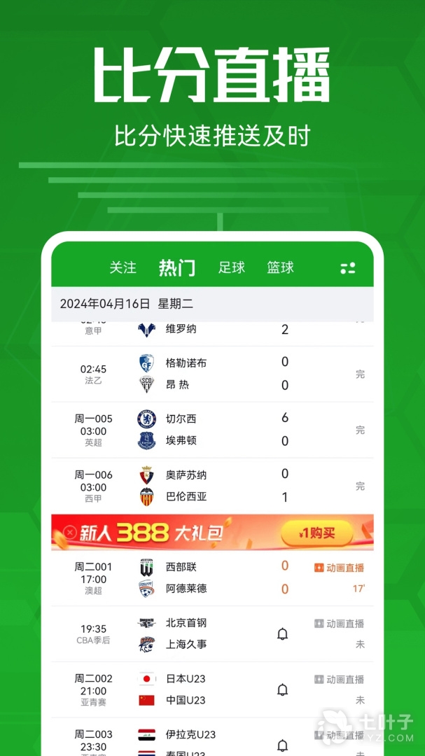 全球足球篮球赛事,即时比分,支持定制进球提醒。