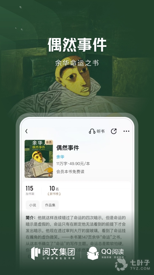 《四喜》:童瑶、蒋欣、黄明昊主演热播剧《四喜》原著小说。家家有本难念的经,看他们如何在爱与纷争中将日子过顺。《偶然事件》:余华命运之书,在这本书中,余华写下了34个命运。他从这本书确立“命运”的写作主题。《千劫眉》:罗云熙主演影视剧《水龙吟》原著小说,爆款剧《莲花楼》作者藤萍经典作品。《入青云》:侯明昊、卢昱晓主演电视剧原著小说,宿敌骗侣以身为棋,共启青云巅峰博弈,读原著看双强“马甲”夫妇相爱相杀!解锁更多精彩内容,快来QQ阅读。