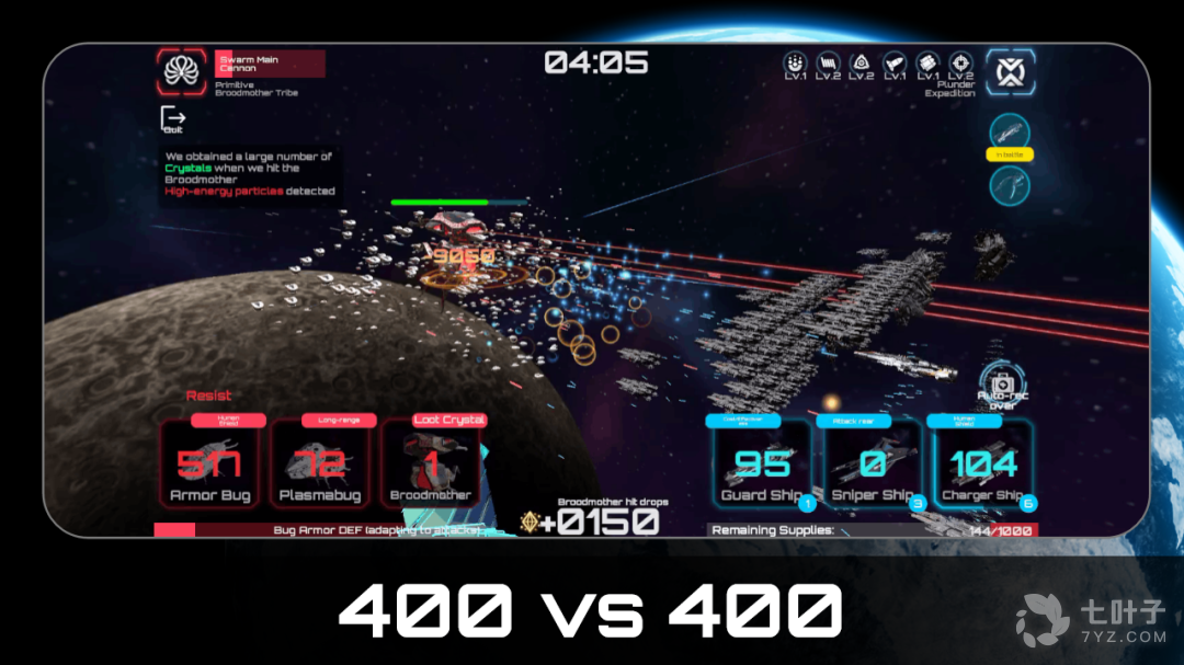 3、操纵战舰上手不太好控制,尤其是战舰血量很少,并且敌舰撞击伤害极高,所以怎么从敌舰密集的地方拿到残骸的exp而不死就变成了很考虑操作性的玩点,并且怎么把敌舰不要留到下一波敌舰出现的地方也蛮要卡轴的(说的就是你,主炮)打到第十关,手法这个时候已经还好了,聚怪和绕敌骗炮也能做到了,技能的话,无人机是真的好用,无论海盗图清杂还是虫族图的杀BOSS都是可以自由放置的存在,导弹对于打BOSS也不错,齐射……后面虫群几百几百的来齐射是真没用,主炮,说到这就要说了,提示里的主炮对虫族有奇效其实是只对虫族的杂兵才有用:)打虫族旗舰是真刮痧,可能我截图没截上,第九关带了女王号为了打虫族杂兵结果小兵全杀完了之后跟虫族旗舰硬嗑五分钟,伤害全是导弹打的(雾),镭射暴雨花里胡哨的清理靠近的敌舰还行