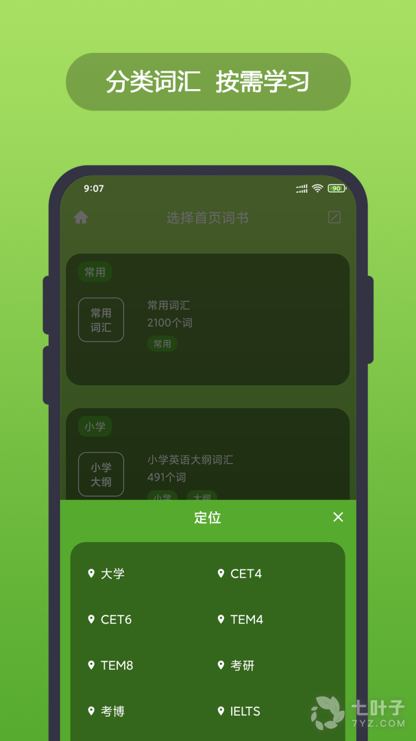 提供了”常用词汇”、”CET4”、”CET6”、”GRE”、”雅思”、”考研”、”托福”、”专属词汇”等单词本信息,可根据需求自主选择,分类学习。