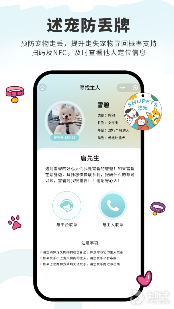 购买防丢牌,绑定宠物后扫码或NFC可联系宠主,宠主可实时查看定位信息,预防宠物走丢,提高寻回机率。