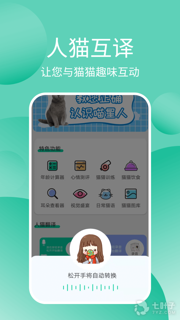 猫猫交流器是一款专为爱猫人士开发的动物翻译器,软件中有人猫互译、年龄计算、心情测评、猫猫训练、猫猫饮食、耳朵查看等功能。