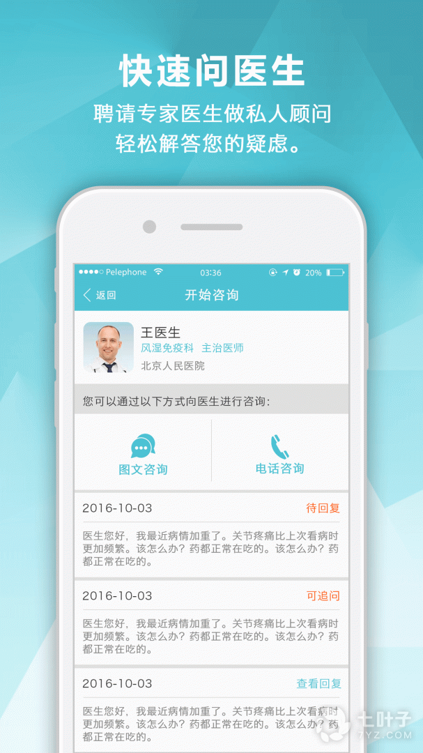 2、用户可以先在这里依据权威诊断标准来快速判断一下自己的腿部是否有疾病,然后也可以在线咨询医生,请医生来帮助解答自己的疑虑,同时平台上面也支持健康日志记录、智能管理电子病历等等