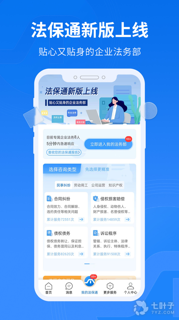 2、普通用户开通法务服务套餐后,您遇到的所有法律问题都需要在屏幕下方“法务部”里进行咨询和解决,会有专属团队服务您;