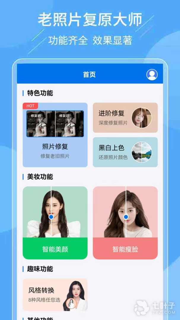 1、老照片复原大师是小编见过的修复功能最多的软件,它包含修复功能、美妆功能和趣味功能,既可以修复有着各种问题的老照片,又能美颜美化人像照片,还能玩转照片,转换照片风格