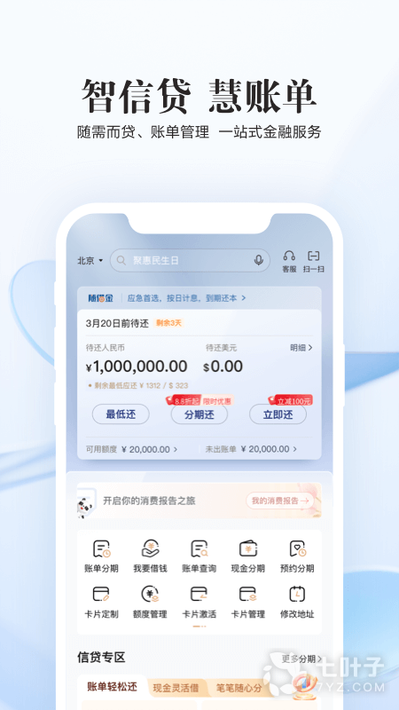 信用卡查询、账单查询、交易明细、信用卡积分查询、信用卡还款、 约定还款、购汇还款、 信用卡转出、自由分期、账单分期、 信用卡设置 、信用卡激活、 预约办卡、申请进度查询等。
