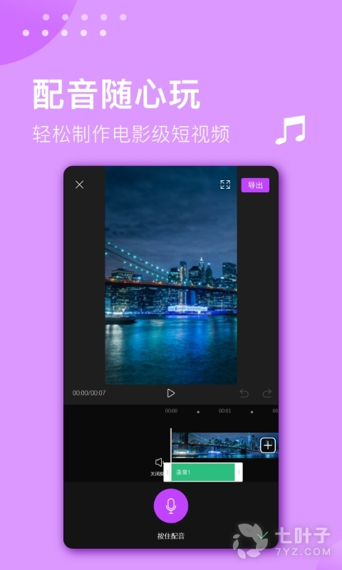 4、而通过右侧的“配音”选项,大家还可以为编辑的视频添加手机里的音乐或自己的录音,添加完成后点击上方“导出”选项,就可以保存该视频了。