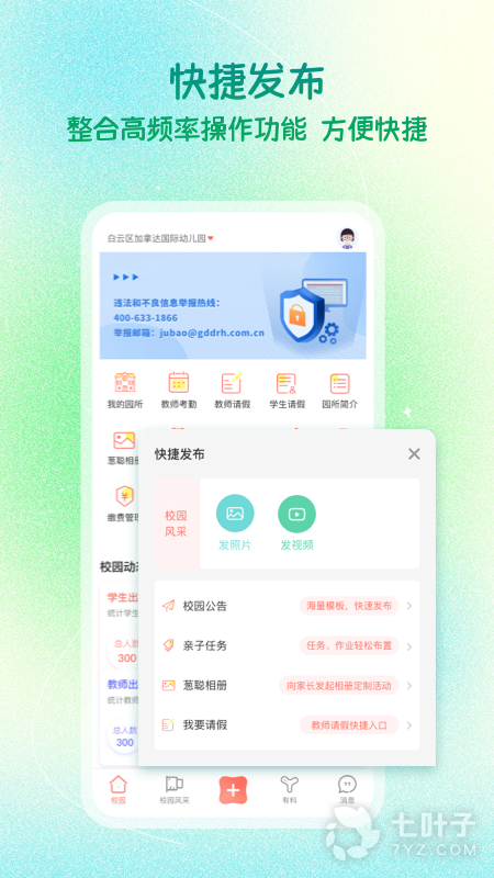 2、通过软件可以在线记录老师考勤。管理请假、管理园所班级等,帮助院长高效办公。老师的考勤状况都可以在这里查看,出现什么异常的话也可以及时处理;食谱安排也能查询到,更好的照顾所有的班级的学生,营养均衡,让孩子更好的成长