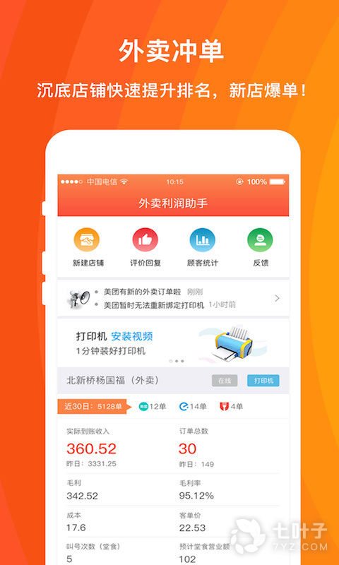 3、外卖利润助手App是专门为外卖商家提供利润计算的营销助手,软件可以协助商家快速接单,精确的计算外卖成本,同时可以接收多家平台的外卖订单,为门店增加利润收入,让生意越做越火,轻松掌管门店快捷方便
