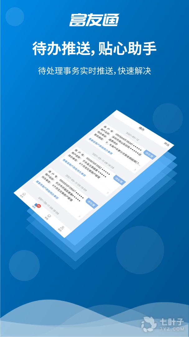 2、富友通是业务员用于商户拓展的软件,可以在这里为商户在线办理入网,自己拓展的新增商户数和交易额都可以清楚看到,还可以对商户进行分类管理,如果出现异常情况也可以及时的去了解,每天还可以查看自己的待办事项,避免忘记