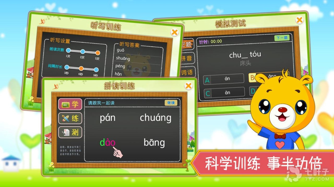 1、款经典测验游戏,提升宝贝的拼音学习兴趣,从而达到快速学习、培养宝贝独立阅读的目的