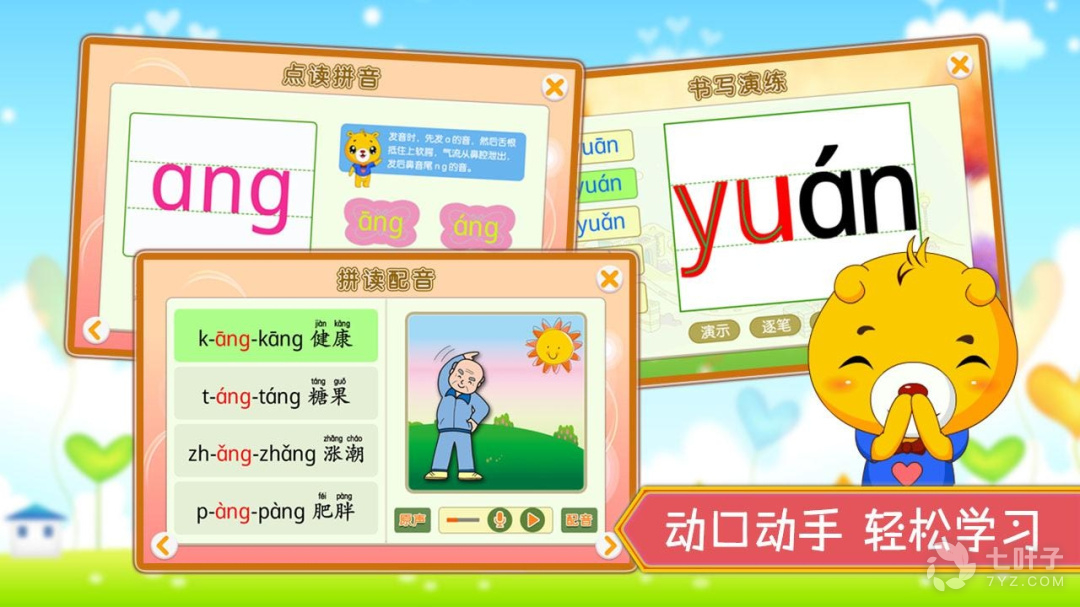 4、融合了拼音笔顺、词组发音、卡通插图以及朗朗上口的顺口溜, 以发散形记忆方式, 让宝宝更快的掌握标准的拼音发音