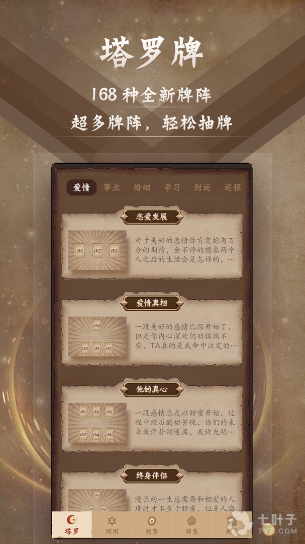 【塔罗玩法】22张大阿尔卡拉牌的经典玩法,结合塔罗师精心设计的168种牌,每张都图文并茂的为您提供牌义的解释,让您清楚的知晓您在爱情,学习,婚姻,人际,事业,财运,健康,我的,运程,综合的未来方向,让你更加了解您的过去,现在,未来。