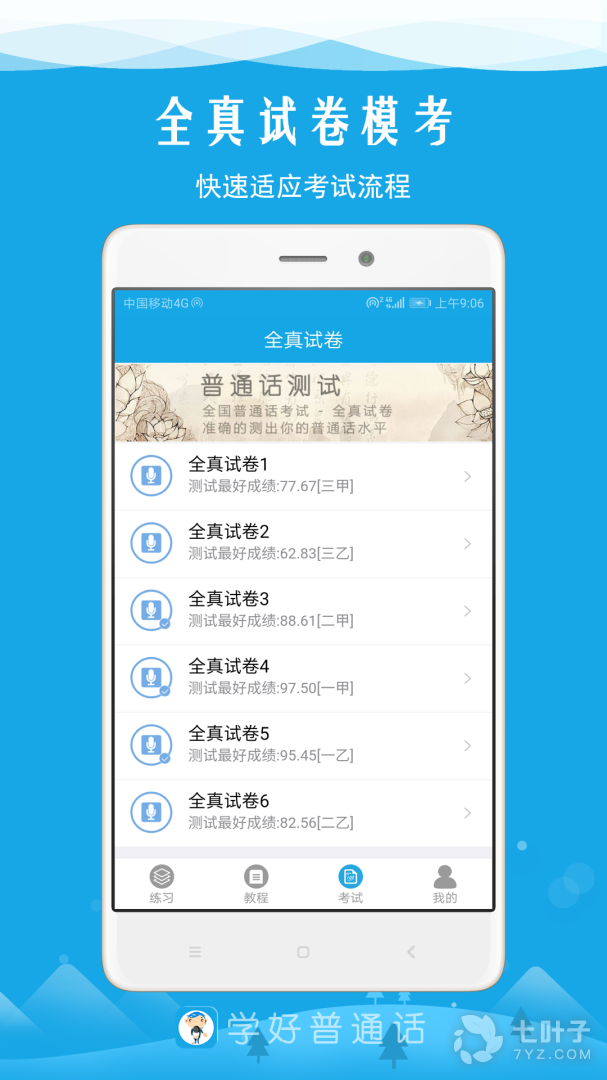 软件拥有与全国普通话水平测试相同发音的评分技术,我们采用全真普通话考试试卷,每一个发音均可真实测评,让你边练边测,实时纠正,时刻提高自己的普通话发音水平。