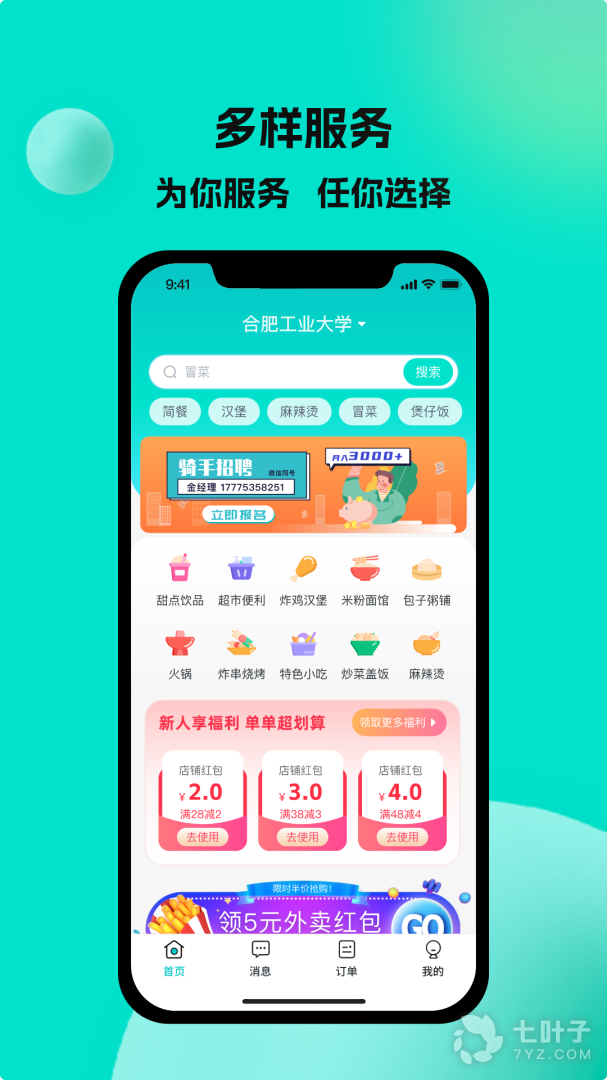 2、校蜂侠,让你的校园服务变得更加的轻松,用户在这里可以轻松下单附近的美食,平台都会为你送上门,这样自己不想去食堂排队等待的话也是可以轻松吃到香喷喷的饭菜的,另外用户如果有想兼职的用户的话还可以在这里做美食配送的工作,既不会耽误自己学习还可以赚取一点的收入