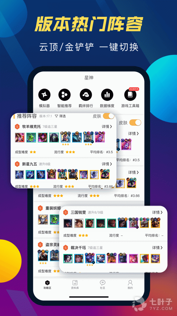 2、TFT云顶攻略助手帮助你轻松查询游戏详细官方数据,也有智能阵容推荐和各区服阵容伤害测试,模拟器功能帮助你测试不同阵容的强度,还有丰富攻略内容等你来看!下载TFT云顶攻略助手一起体验吧