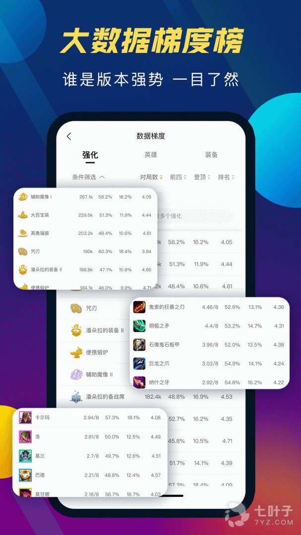 2、游戏数据查询英雄装备数据、评级,羁绊职业数据,天选概率等各种数据一应俱全