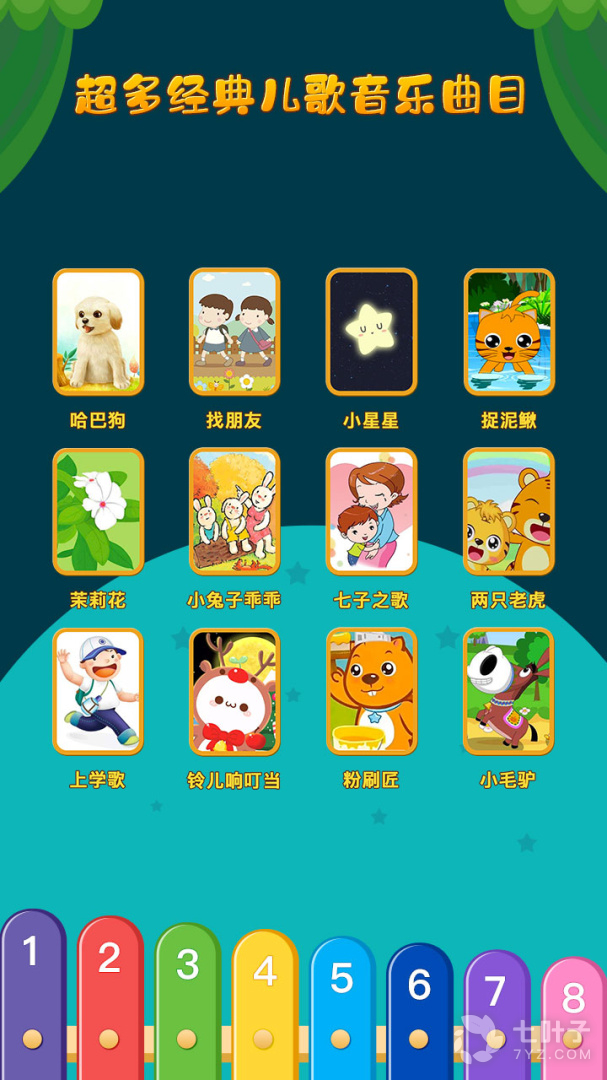 5、小毛驴、数鸭子、捉泥鳅、茉莉花、找朋友、哈巴狗、小兔子乖乖、铃儿响叮当、上学歌、七子之歌、小星星、两只老虎、粉刷匠等多首宝宝耳熟能详的儿歌童谣,跟着弹出的节奏唱起来