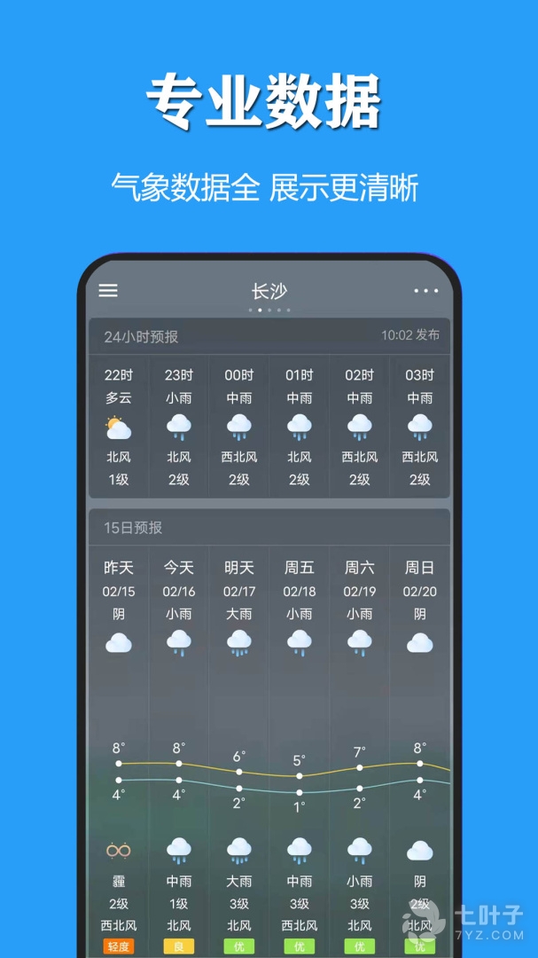 2、丰富天气信息:实时天气数据、未来24小时天气预报、15日天气预报、40日天气预报、空气质量指数、空气污染指数、pm2.5、风力、温度、湿度、日出日落、气压、能见度。