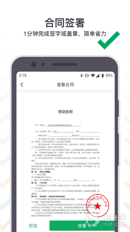 2、用户可以使用软件来进行电子合同的签约,这里的都是具有法律效率的,跟纸质的合同一样,但是比它更简单,在这里一分钟就可以进行签字或盖章,随时随地都可以进行