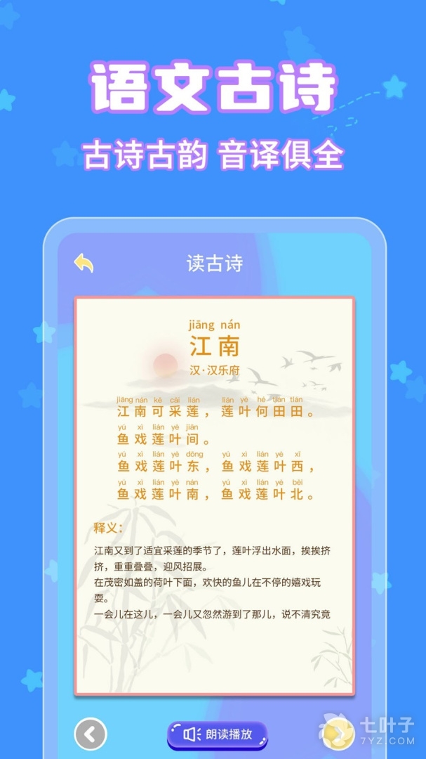 5、读古诗经典百首古诗在线学习,人声朗读全诗标注拼音,配有专业的朗读示范,引导孩子跟读朗诵古诗