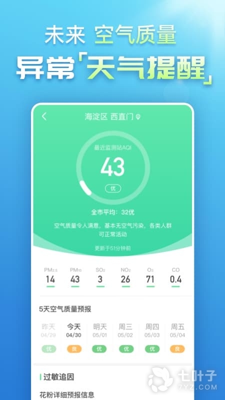 异常天气情况及时提醒。强大天气预报功能,实时监测天气信息、空气质量、温度变化、紫外线强度等情况,帮助您及时做好防范。