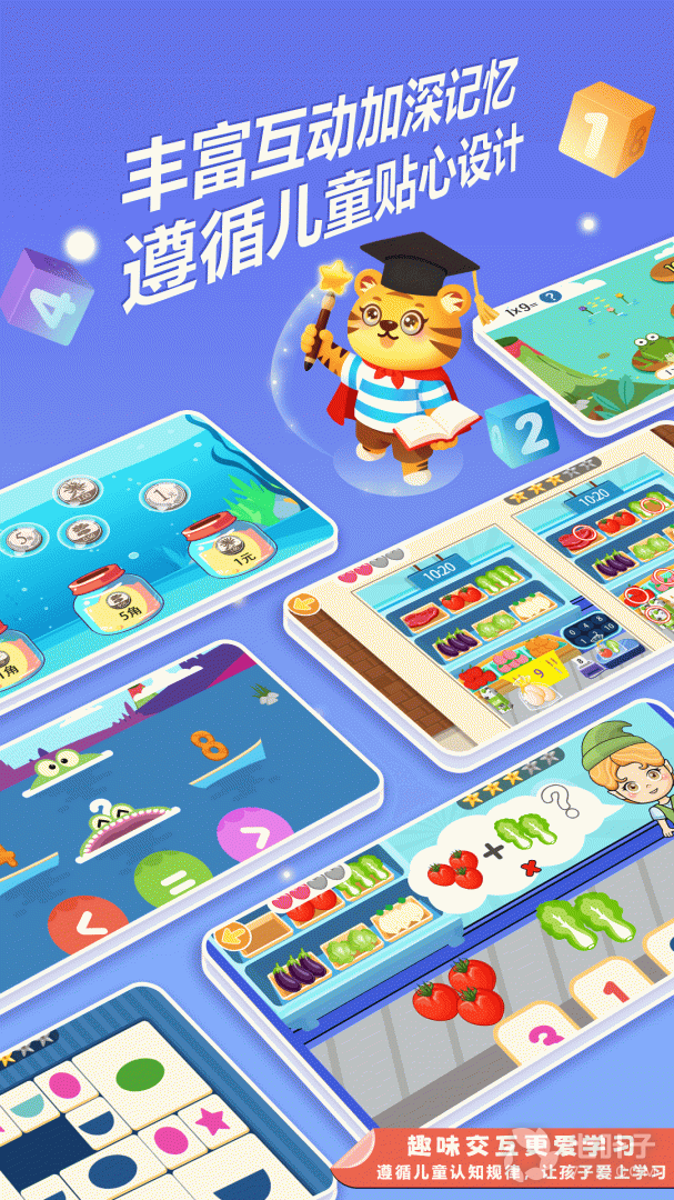 • 100 多个精心打造的教学游戏,激励持续时间更长的学习。包含2到10岁数学学习的大部分内容,数字,分类,颜色,时钟,形状,加法,减法,乘法,除法,匹配,找规律等各种教学内容。