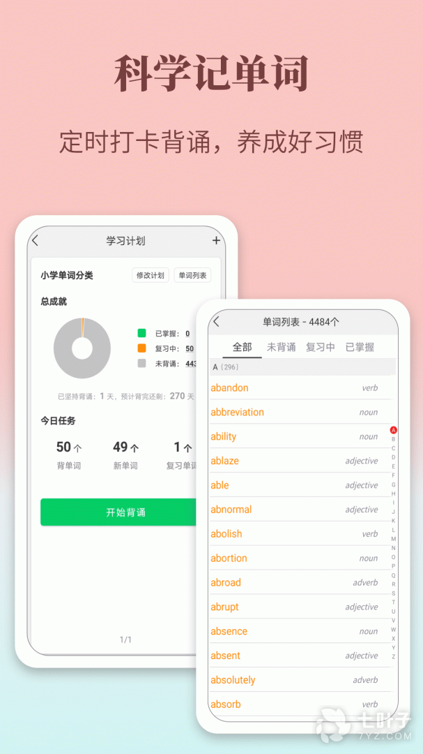 App特别设计背单词栏目,每天定时提醒单词背诵打卡,帮助学习者养成坚持背单词的好习惯。