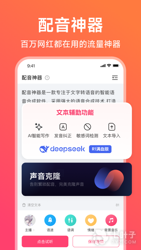 3、《配音神器》App是高效的文字配音工具,可以编辑文本选择适合的播音员为你配音,文字语音之间轻松转换,适用于短视频解说、公司宣传以及广告叫卖等,免费使用,多种功能齐全,全面满足用户的需求
