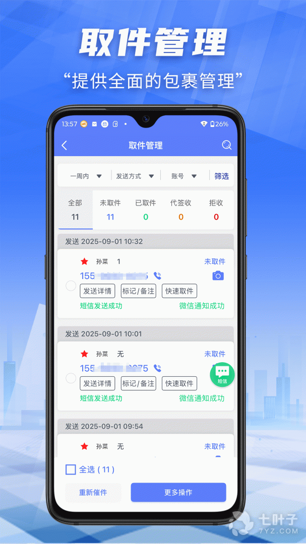 1、快递员小扁担是专门为驿站快递员打造的手机群发短信软件,在这里快递员可以使用软件在线进行号码录入功能,使用软件即可进行群发短信,同时还可以进行短信定时发送功能,同时支持扫描手机号码,使用方便省钱