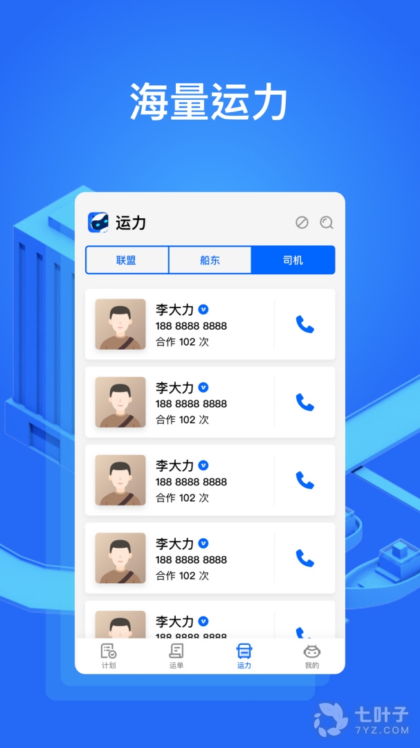 4、海量运力在线,在线寻找车源的时候不仅找到海量运力而且可以电话呼叫司机;