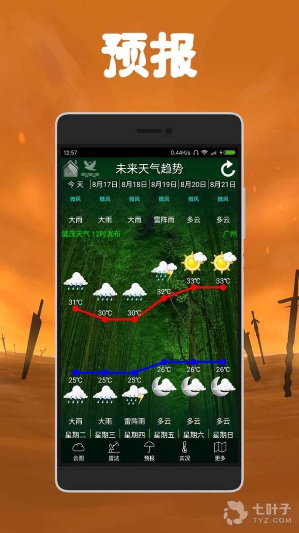 2、健茂天气,这是款界面简洁的天气预报软件,在这上面,你不但可对各种县级以上城市天气实况等信息进行掌握了解,而且还可查看台风的实时路径、流场动画,更有气象卫星图及时提供