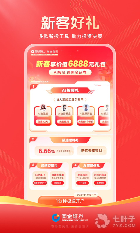 3、支持7x24小时在线开通沪深A股股票账户,支持在线开立港股通、创业板、新三板、科创板、基金理财等证券账户或投资权限