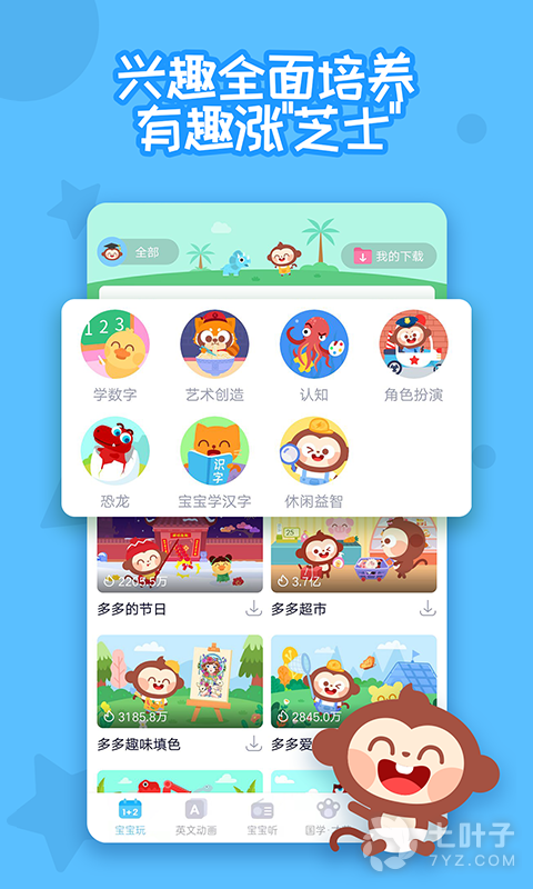 3、内容超全:涵盖学数学、学汉字、幼儿认知、艺术创造、角色扮演的多款精美小课件,让宝宝在动漫人物的引导下学知识、长见识