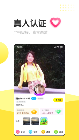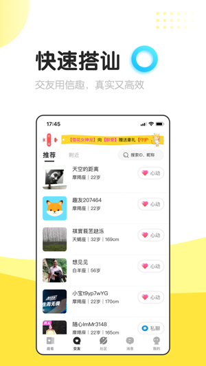1、这里有超多的来自全国各地的小哥哥小姐姐,所有的用户都是经过实名认证,拒绝照骗现象。系统会根据你的基础信息,利用AI智能匹配,帮你快速找到兴趣相投的朋友,大家在这里畅所欲言,分享生活中的趣事,建立个性化标签,展现自己的才艺,让更多的人认识你,丰富自己的生活,拓展人脉