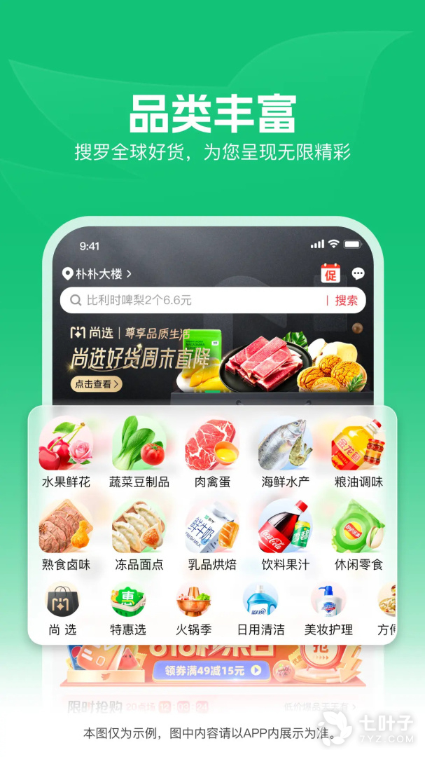 3、品类齐全:新鲜蔬菜、水果、肉禽蛋、米面粮油,水产海鲜、南北干货、方便速食,应有尽有,厨房用品也能买到哦