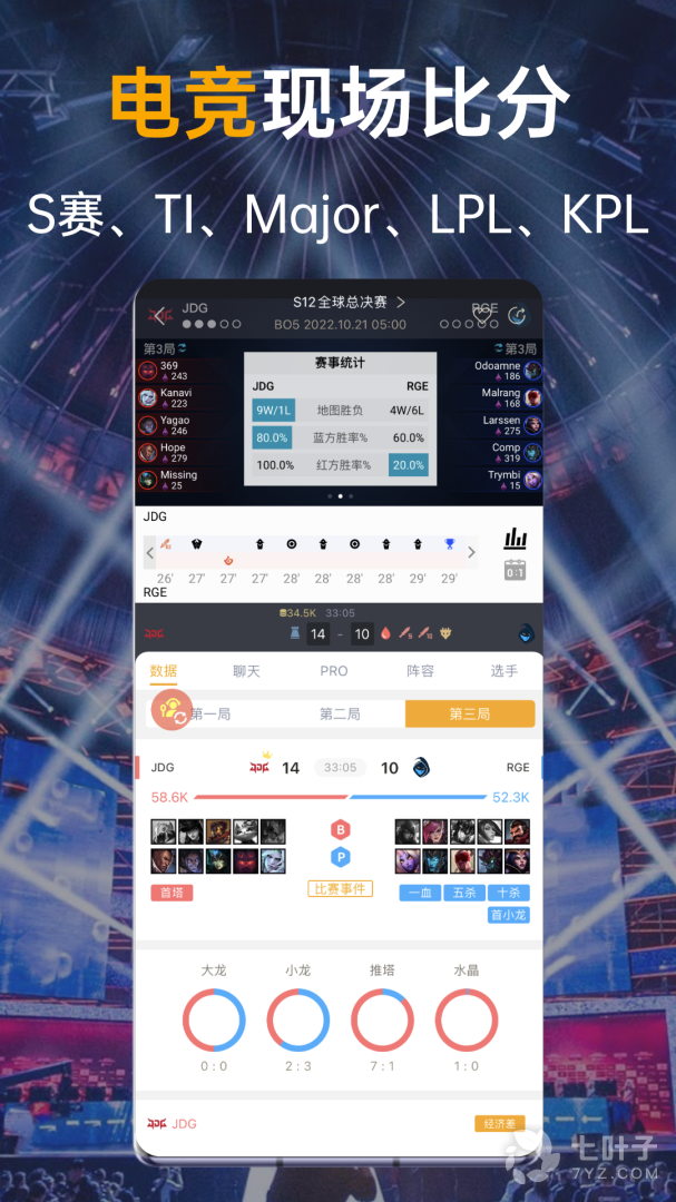 3、无延迟电竞足篮球比分APP内包含电竞英雄联盟LPL、LDL、LCK,DOTA2 DPC、Ti、CSGO Major、IEM、王者荣耀KPL 、KGL、足球英超、意甲、西甲、法甲、德甲,篮球NBA、CBA等比赛,均有无延迟现场级数据体验,让您掌握信息快人一步