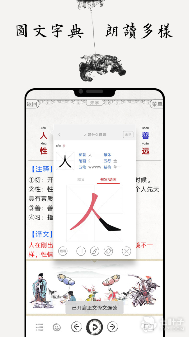 【软件界面】图文并茂,水墨风插画匹配正文大意,方便学习与理解。