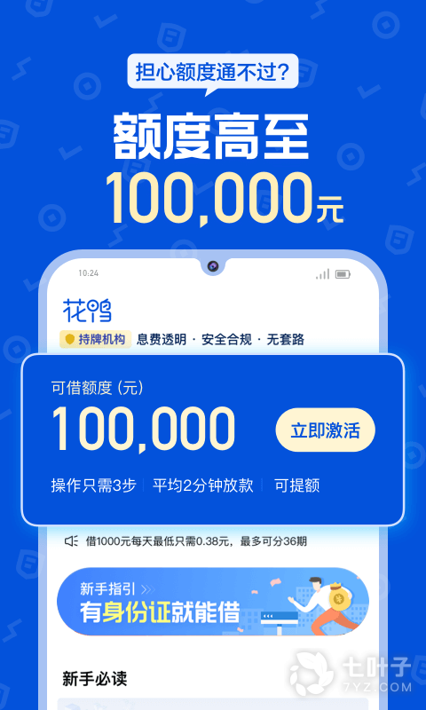 当您用自己手机下载花鸭借钱App后,进入借款入口,点击立即激活额度→填写资料→获得额度。