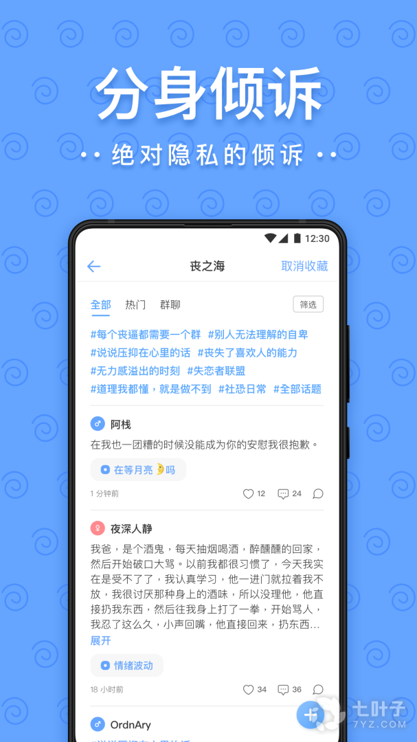 3、用户之间能够相互倾诉,在这里没有人知道你是谁,你能够随心所欲发泄自己的情绪,平台上的用户均为私密设置,不同的对话用户能够使用不同的名字