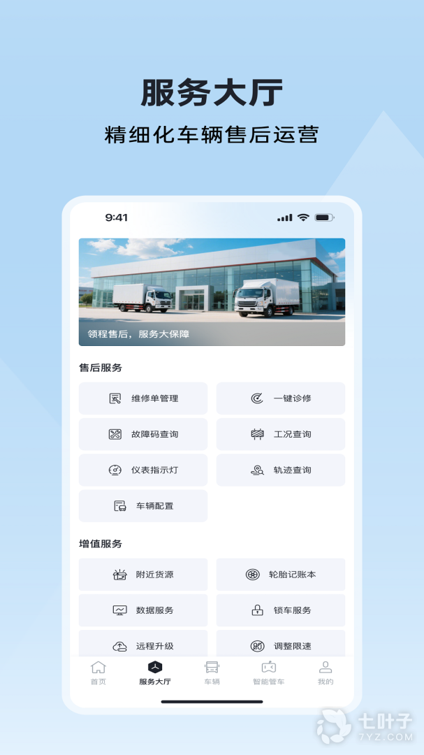 服务大厅:维修概况、一键诊断、故障查询、工况查询、仪表指示灯、轨迹查询、车辆配置、附近货源、数据服务、锁车服务、限速设置;
